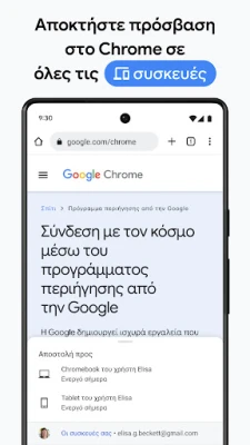 Η εμπειρία σας με το Chrome δεν περιορίζεται σε μία συσκευή, αλλά σας ακολουθεί απρόσκοπτα παντού. Χάρη στον Συγχρονισμό στις συσκευές, οι σελιδοδείκτες, οι καρτέλες και οι αποθηκευμένοι κωδικοί πρόσβασής σας είναι πάντα διαθέσιμοι, είτε χρησιμοποιείτε το τηλέφωνο, τον υπολογιστή ή το tablet σας – απλώς συνδεθείτε. Οργανώστε την ψηφιακή σας ζωή αποτελεσματικά με τις Ομάδες Καρτελών, διατηρώντας την τάξη και την παραγωγικότητα σε όλα σας τα gadgets. Επιπλέον, εξοικονομήστε πολύτιμο χρόνο με τη λειτουργία Αυτόματης Συμπλήρωσης, η οποία γεμίζει αυτόματα στοιχεία πληρωμών, διευθύνσεις και κωδικούς πρόσβασης, κάνοντας κάθε σας online συναλλαγή και είσοδο ταχύτερη και απλούστερη. Το Chrome διασφαλίζει ότι η περιήγησή σας είναι πάντα συνδεδεμένη, οργανωμένη και εξαιρετικά βολική.