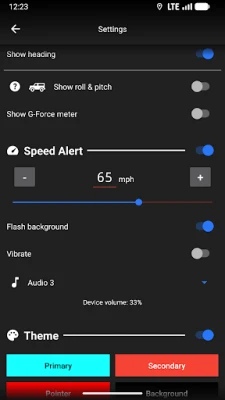 Για τους λάτρεις της οδήγησης, η εφαρμογή περιλαμβάνει έναν ακριβή μετρητή δυνάμεων G, καθώς και ένα γραφικό στοιχείο κύλισης και πρόνευσης (Roll & Pitch) για την παρακολούθηση της δυναμικής του οχήματος. Μην χάσετε ποτέ ένα όριο ταχύτητας χάρη στις ρυθμιζόμενες ηχητικές και οπτικές ειδοποιήσεις ταχύτητας που σας κρατούν ενήμερους. Προσαρμόστε την εμφάνιση της εφαρμογής με την εκτεταμένη χρωματική παλέτα, δημιουργώντας ένα περιβάλλον που σας ταιριάζει απόλυτα. Και αυτά είναι μόνο μερικά από τα πολλά χαρακτηριστικά που σας περιμένουν να ανακαλύψετε, κάνοντας κάθε σας διαδρομή πιο ενημερωμένη και ενδιαφέρουσα.