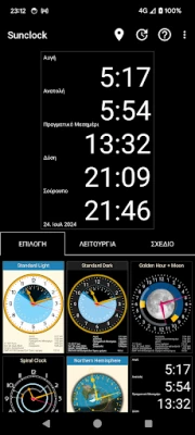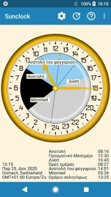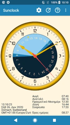 Το Sunclock είναι ένα αστρονομικό ρολόι που προσφέρει λεπτομερή απεικόνιση της ώρας. Δείτε την ώρα της πόλης, τις ακριβείς ώρες ανατολής και δύσης του ηλίου, καθώς και τις διάφορες φάσεις του λυκόφωτος, για μια ολοκληρωμένη εικόνα της φυσικής πορείας της ημέρας.